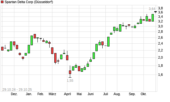 Mit dem Anstieg auf 3,58 EUR hat die Spartan Delta-Aktie (ISIN CA84678A5089) am 28.10.2025 ein neues 12-Monats-Hoch erreicht und damit den Kurs vom 27.10.2025 eingestellt.
