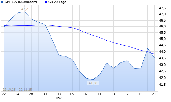 Mit dem Rücksetzer auf 43,44 EUR hat die Spie-Aktie am 21.11.2025 die 20-Tage-Linie nach unten gekreuzt.