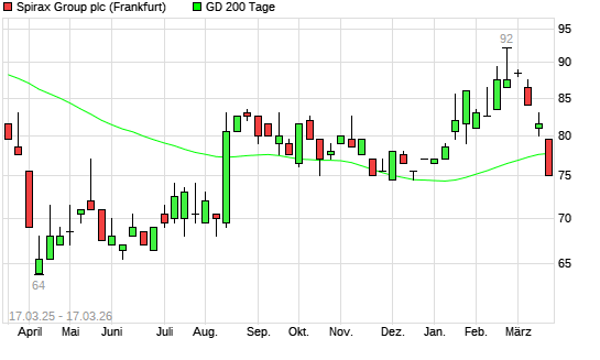Mit dem Rücksetzer auf 77,00 EUR hat die Spirax-Sarco-Aktie am 16.03.2026 die 200-Tage-Linie nach unten gekreuzt.