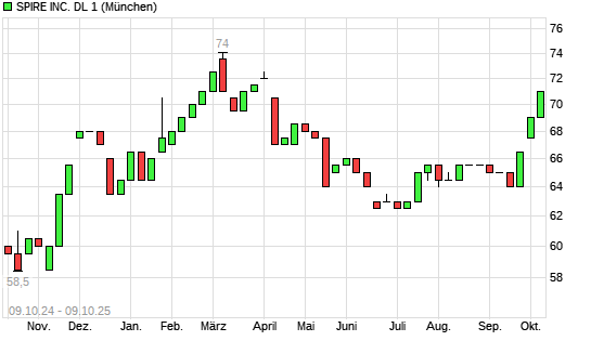 Mit dem Anstieg auf 70,00 EUR hat die Spire-Aktie (ISIN US84857L1017) am 08.10.2025 ein neues 6-Monats-Hoch erreicht und damit den Kurs vom 03.10.2025 eingestellt.