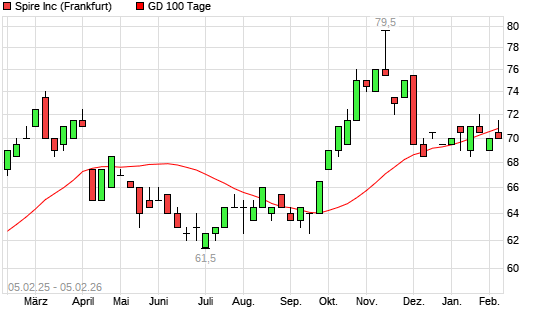 Die Spire-Aktie befindet sich seit dem 25.09.2025 im langfristigen Aufwärtstrend und hat in diesem Zeitraum +7,70% an Wert gewonnen. Der Abstand zur 200-Tage-Linie beträgt aktuell +4,97%.