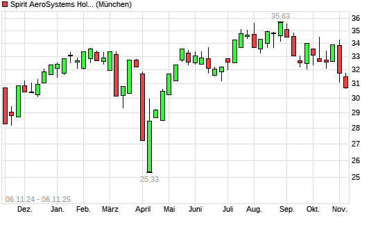 Mit dem Rücksetzer auf 31,02 EUR hat die Spirit Aerosystems-Aktie (ISIN US8485741099) am 05.11.2025 ein neues 6-Monats-Tief erreicht und damit den Kurs vom 26.06.2025 eingestellt.