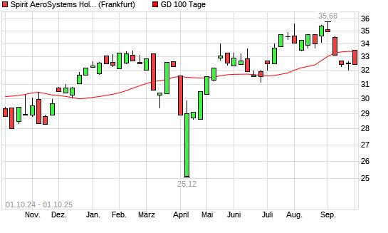 Mit dem Rücksetzer auf 32,76 EUR hat die Spirit Aerosystems-Aktie am 30.09.2025 die 100-Tage-Linie nach unten gekreuzt.