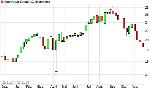 Mit dem Rücksetzer auf 18,30 EUR hat die Sportradar Group AG-Aktie (ISIN CH1134239669) am 21.11.2025 ein neues 6-Monats-Tief erreicht und damit den Kurs vom 18.11.2025 eingestellt.