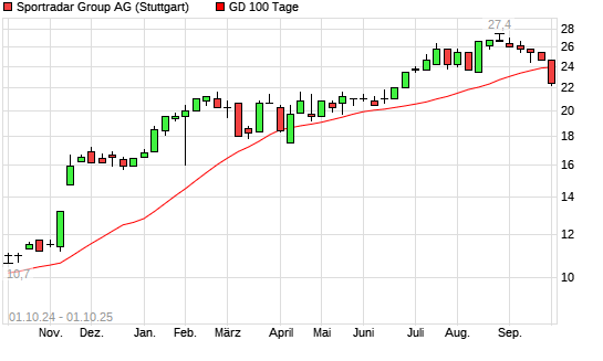 Mit dem Rücksetzer auf 22,40 EUR hat die Sportradar Group AG-Aktie am 30.09.2025 die 100-Tage-Linie nach unten gekreuzt.