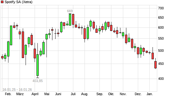 Mit dem Rücksetzer auf 436,05 EUR hat die Spotify Technology-Aktie (ISIN LU1778762911) am 15.01.2026 ein neues 12-Monats-Tief erreicht und damit den Kurs vom 14.01.2026 eingestellt.