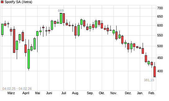 Mit dem Rücksetzer auf 406,75 EUR hat die Spotify Technology-Aktie (ISIN LU1778762911) am 03.02.2026 ein neues 12-Monats-Tief erreicht und damit den Kurs vom 29.01.2026 eingestellt.