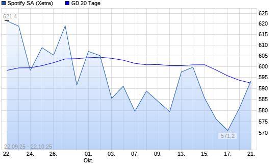 Mit dem Anstieg auf 595,30 EUR hat die Spotify Technology-Aktie am 21.10.2025 die 20-Tage-Linie nach oben gekreuzt.
