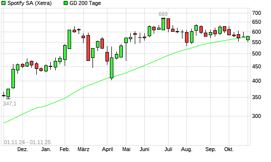 Mit dem Rücksetzer auf 567,00 EUR hat die Spotify Technology-Aktie am 31.10.2025 die 200-Tage-Linie nach unten gekreuzt.