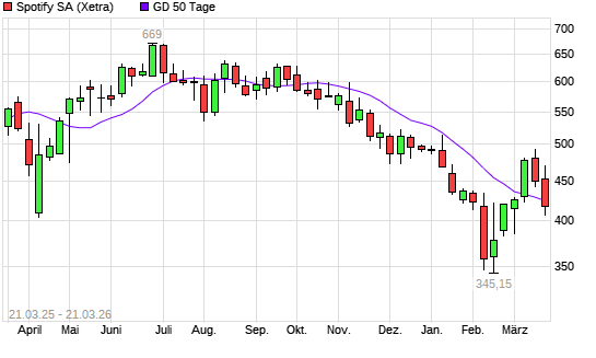 Mit dem Rücksetzer auf 408,45 EUR hat die Spotify Technology-Aktie am 20.03.2026 die 50-Tage-Linie nach unten gekreuzt.