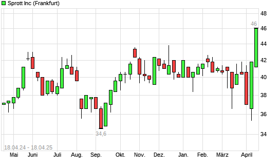 Mit dem Anstieg auf 46,00 EUR hat die Sprott-Aktie (ISIN CA8520662088) am 17.04.2025 ein neues 12-Monats-Hoch erreicht und damit den Kurs vom 16.04.2025 eingestellt.