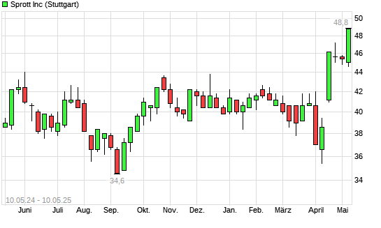 Mit dem Anstieg auf 48,80 EUR hat die Sprott-Aktie (ISIN CA8520662088) am 09.05.2025 ein neues 3-Jahres-Hoch erreicht und damit den Kurs vom 08.05.2025 eingestellt.