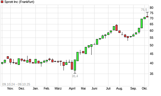 Mit dem Anstieg auf 75,50 EUR hat die Sprott-Aktie (ISIN CA8520662088) am 08.10.2025 ein neues All-Time-High erreicht und damit den Kurs vom 07.10.2025 eingestellt.