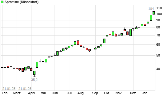 Mit dem Anstieg auf 104,00 EUR hat die Sprott-Aktie (ISIN CA8520662088) am 20.01.2026 ein neues All-Time-High erreicht und damit den Kurs vom 19.01.2026 eingestellt.