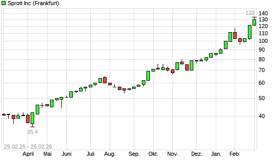 Mit dem Anstieg auf 133,00 EUR hat die Sprott-Aktie (ISIN CA8520662088) am 24.02.2026 ein neues All-Time-High erreicht und damit den Kurs vom 23.02.2026 eingestellt.