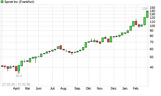 Mit dem Anstieg auf 139,00 EUR hat die Sprott-Aktie (ISIN CA8520662088) am 26.02.2026 ein neues All-Time-High erreicht und damit den Kurs vom 25.02.2026 eingestellt.