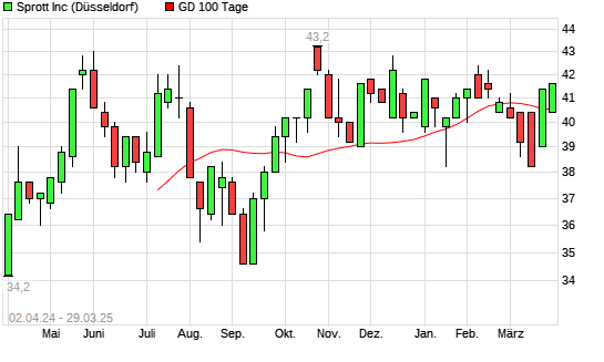 Mit dem Rücksetzer auf 40,40 EUR hat die Sprott-Aktie am 28.03.2025 die 100-Tage-Linie nach unten gekreuzt.