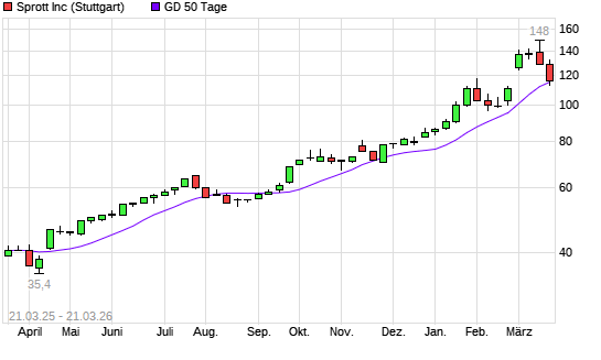 Mit dem Rücksetzer auf 110,00 EUR hat die Sprott-Aktie am 20.03.2026 die 50-Tage-Linie nach unten gekreuzt.