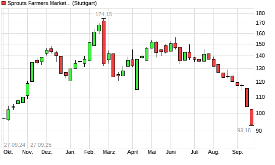 Mit dem Rücksetzer auf 93,96 EUR hat die Sprouts Farmers Market-Aktie (ISIN US85208M1027) am 26.09.2025 ein neues 12-Monats-Tief erreicht und damit den Kurs vom 25.09.2025 eingestellt.