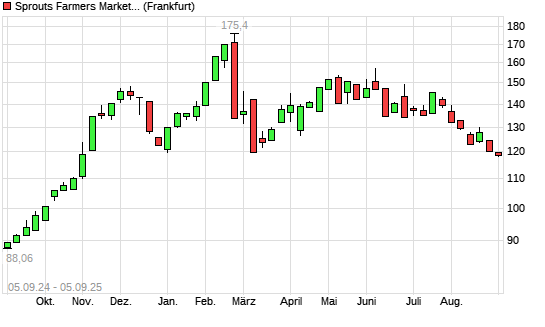 Mit dem Rücksetzer auf 118,25 EUR hat die Sprouts Farmers Market-Aktie (ISIN US85208M1027) am 04.09.2025 ein neues 6-Monats-Tief erreicht und damit den Kurs vom 02.09.2025 eingestellt.