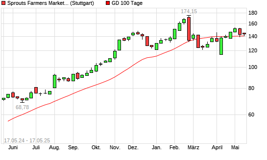 Mit dem Anstieg auf 150,75 EUR hat die Sprouts Farmers Market-Aktie am 16.05.2025 die 100-Tage-Linie nach oben gekreuzt.