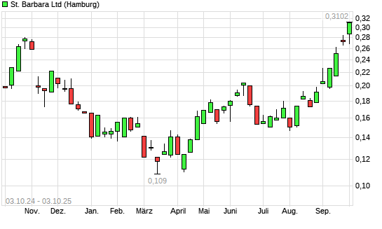 Mit dem Anstieg auf 0,32 EUR hat die St. Barbara-Aktie (ISIN AU000000SBM8) am 02.10.2025 ein neues 3-Jahres-Hoch erreicht und damit den Kurs vom 29.09.2025 eingestellt.