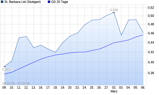 Mit dem Rücksetzer auf 0,45 EUR hat die St. Barbara-Aktie am 06.03.2026 die 20-Tage-Linie nach unten gekreuzt.
