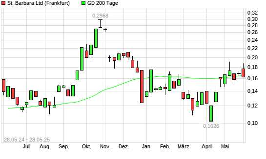 Mit dem Rücksetzer auf 0,16 EUR hat die St. Barbara-Aktie am 27.05.2025 die 200-Tage-Linie nach unten gekreuzt.