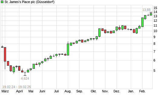 Mit dem Anstieg auf 13,88 EUR hat die St. James's Place-Aktie (ISIN GB0007669376) am 18.02.2025 ein neues 12-Monats-Hoch erreicht und damit den Kurs vom 17.02.2025 eingestellt.
