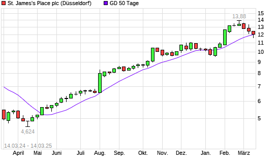 Mit dem Rücksetzer auf 11,87 EUR hat die St. James's Place-Aktie am 13.03.2025 die 50-Tage-Linie nach unten gekreuzt.