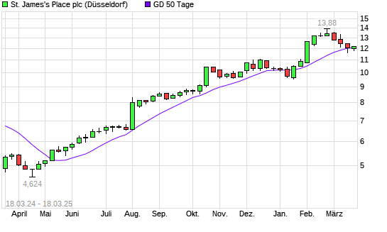 Mit dem Rücksetzer auf 12,04 EUR hat die St. James's Place-Aktie am 17.03.2025 die 50-Tage-Linie nach unten gekreuzt.