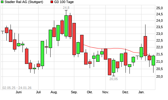 Mit dem Anstieg auf 21,36 EUR hat die Stadler Rail-Aktie am 23.01.2026 die 100-Tage-Linie nach oben gekreuzt.Die Stadler Rail-Aktie befindet sich seit dem 12.01.2026 im langfristigen Abwärtstrend ...weiterlesen