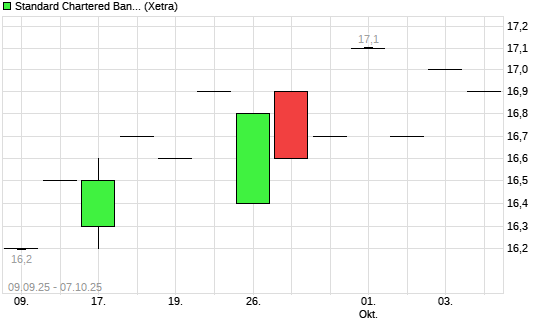 Mit dem Anstieg auf 17,10 EUR hat die Standard Chartered Bank-Aktie (ISIN GB0004082847) am 06.10.2025 ein neues 10-Jahres-Hoch erreicht und damit den Kurs vom 02.10.2025 eingestellt.