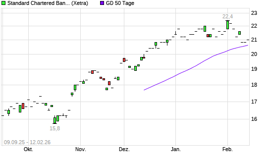 Mit dem Rücksetzer auf 19,80 EUR hat die Standard Chartered Bank-Aktie am 13.02.2026 die 50-Tage-Linie nach unten gekreuzt.