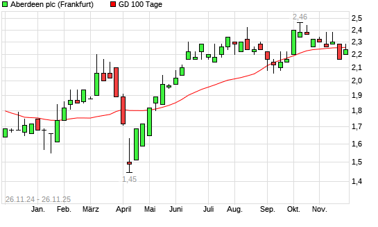 Mit dem Rücksetzer auf 2,22 EUR hat die Standard Life Aberdeen-Aktie am 25.11.2025 die 100-Tage-Linie nach unten gekreuzt.