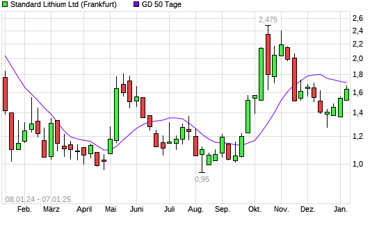 Mit dem Anstieg auf 1,66 EUR hat die Standard Lithium-Aktie am 06.01.2025 die 50-Tage-Linie nach oben gekreuzt.