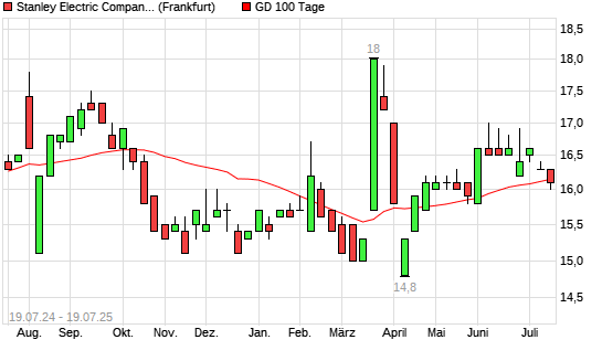 Mit dem Rücksetzer auf 16,10 EUR hat die Stanley Electric Company-Aktie am 18.07.2025 die 100-Tage-Linie nach unten gekreuzt.