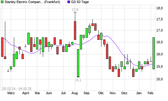 Mit dem Rücksetzer auf 15,40 EUR hat die Stanley Electric Company-Aktie am 03.02.2025 die 50-Tage-Linie nach unten gekreuzt.