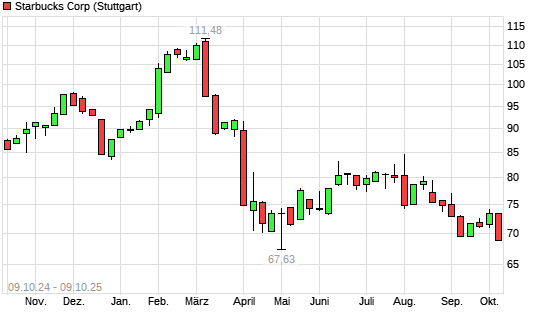 Mit dem Rücksetzer auf 68,91 EUR hat die Starbucks-Aktie (ISIN US8552441094) am 08.10.2025 ein neues 12-Monats-Tief erreicht und damit den Kurs vom 07.10.2025 eingestellt.