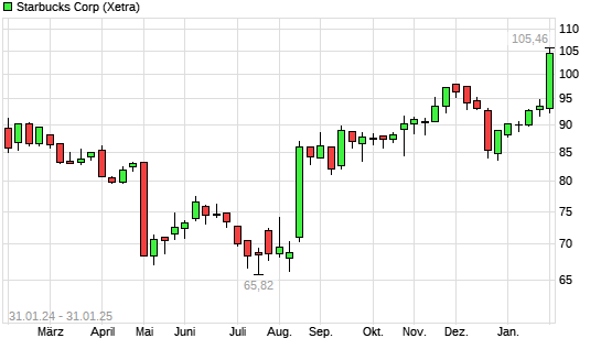 Mit dem Anstieg auf 104,56 EUR hat die Starbucks-Aktie (ISIN US8552441094) am 30.01.2025 ein neues 3-Jahres-Hoch erreicht und damit den Kurs vom 29.01.2025 eingestellt.