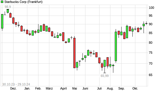 Mit dem Anstieg auf 91,52 EUR hat die Starbucks-Aktie (ISIN US8552441094) am 28.10.2024 ein neues 6-Monats-Hoch erreicht und damit den Kurs vom 23.10.2024 eingestellt.