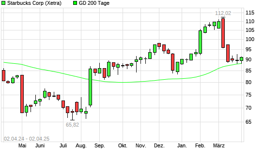 Mit dem Anstieg auf 90,35 EUR hat die Starbucks-Aktie am 01.04.2025 die 200-Tage-Linie nach oben gekreuzt.