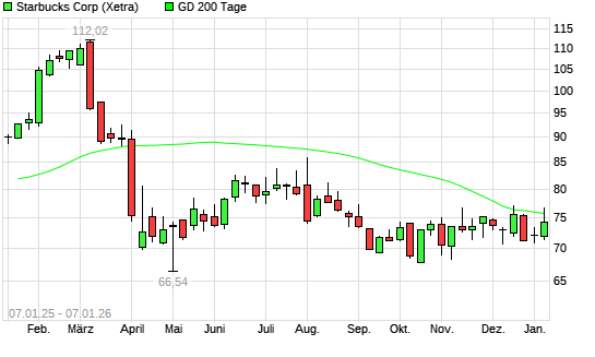 Mit dem Anstieg auf 76,50 EUR hat die Starbucks-Aktie am 06.01.2026 die 200-Tage-Linie nach oben gekreuzt.