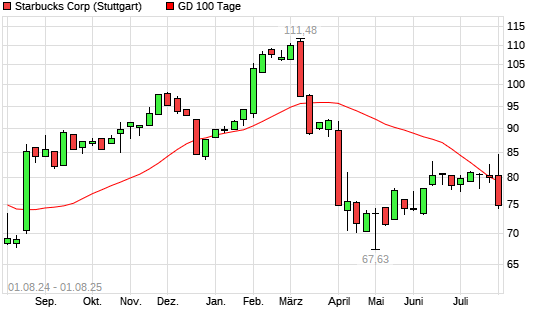Mit dem Rücksetzer auf 77,90 EUR hat die Starbucks-Aktie am 31.07.2025 die 100-Tage-Linie nach unten gekreuzt.