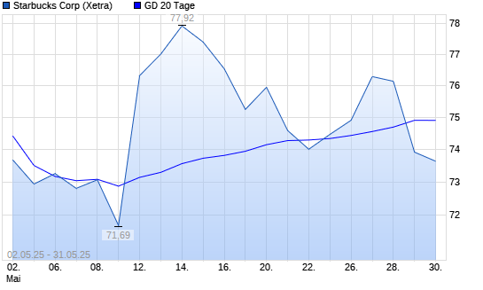 Mit dem Rücksetzer auf 74,28 EUR hat die Starbucks-Aktie am 30.05.2025 die 20-Tage-Linie nach unten gekreuzt.