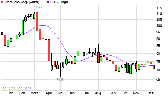 Mit dem Rücksetzer auf 71,63 EUR hat die Starbucks-Aktie am 08.12.2025 die 50-Tage-Linie nach unten gekreuzt.