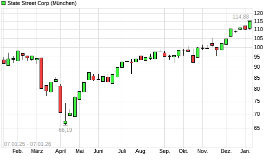 Mit dem Anstieg auf 113,22 EUR hat die State Street-Aktie (ISIN US8574771031) am 06.01.2026 ein neues All-Time-High erreicht und damit den Kurs vom 29.12.2025 eingestellt.