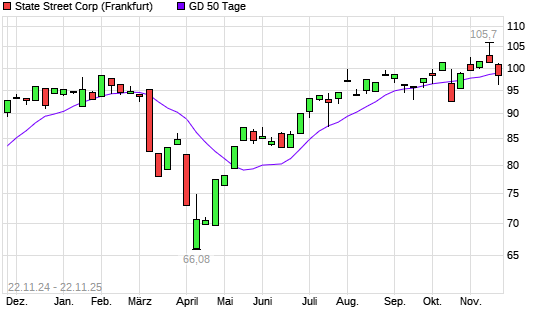 Mit dem Rücksetzer auf 98,22 EUR hat die State Street-Aktie am 21.11.2025 die 50-Tage-Linie nach unten gekreuzt.