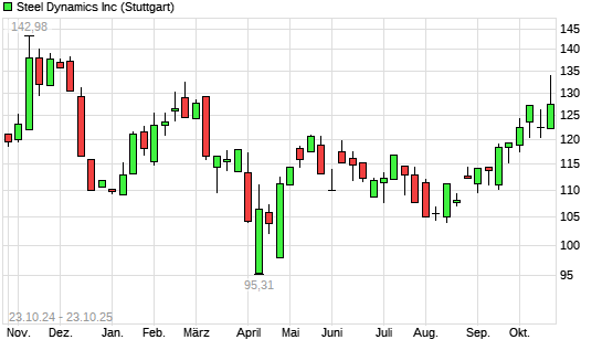 Mit dem Anstieg auf 131,34 EUR hat die Steel Dynamics-Aktie (ISIN US8581191009) am 22.10.2025 ein neues 6-Monats-Hoch erreicht und damit den Kurs vom 10.10.2025 eingestellt.