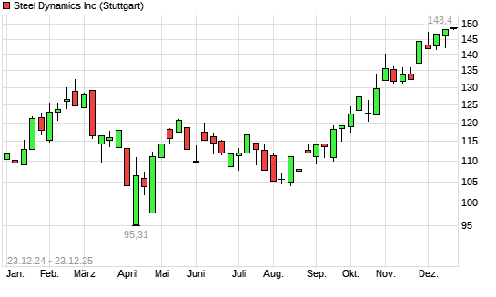 Mit dem Anstieg auf 148,18 EUR hat die Steel Dynamics-Aktie (ISIN US8581191009) am 22.12.2025 ein neues All-Time-High erreicht und damit den Kurs vom 19.12.2025 eingestellt.